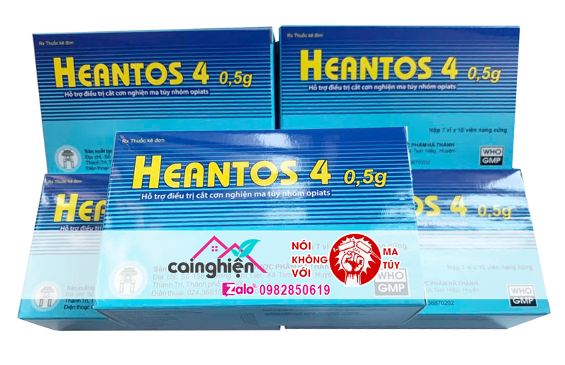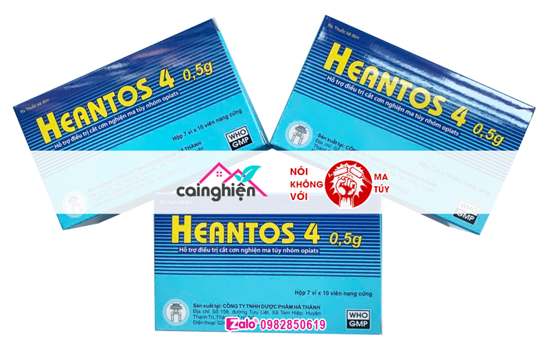 Thành phần của thuốc gồm: Phòng đẳng sâm: 1,0g, A giao: 0,133g, Mạch môn: 0,333g, Hoàng kỳ: 0,333g, Cam thảo: 0,333g, Đương quy: 0,25g, Sinh địa: 0,25g, Bình: 0,25g, Gừng: 0,25g, Quế chi: 0,25g, Đại táo: 0,25g, Táo nhân: 0,166g, Viễn chí: 0,166g, Talc: 0,01g. Tác dụng: Hỗ trợ cắt cơn cai nghiện ma túy, dưỡng tâm, an thần, định trí, phục hồi thải độc, cân bằng hệ thần kinh. Công dụng: Thuốc Heantos 4 hỗ trợ cắt cơn bình ổn các hội chứng trong quá trình cai nghiện, giúp an thần, định trí, đào thải các chất ma túy ra khỏi cơ thể, cường gan thận, giảm thèm nhớ ma túy, phục hồi sức khỏe cho người nghiện. Qua nhiều năm nghiên cứu đội ngũ chuyên gia đã phân tích và đưa ra các liệu trình thuốc kết hợp để hỗ trợ cai thuốc phiện đen, heroin, đá, cỏ, cần sa, thuốc lắc, thuốc lá điện tử... Liều dùng: Liều dùng thuốc Heantos 4 0,5g được đăng ký Bộ Y Tế - Ngày 1: Sáng uống 7 viên, tối uống 7 viên. - Ngày 2: Sáng uống 7 viên, tối uống 7 viên. - Ngày 3: Sáng uống 7 viên, tối uống 7 viên. - Từ ngày thứ 4 trở đi uống 7 viên vào buổi tối. Ưu điểm: An toàn lành tính, dễ sử dụng, dạng cao có mùi thơm. Lưu ý: - Sử dụng thuốc phải tuân theo hướng dẫn của Bác Sĩ có chuyên môn. - Trên thực tế liệu trình kết hợp để cai các loại ma túy khác nhau sẽ có liều dùng khác nhau. - Trong quá trình cai không cho người nghiện sử dụng các thuốc có tiền chất ma túy. - Không nên tiêm truyền trong quá trình cai. - Cai nghiện ma túy là một quá trình phức tạp nên khi gia đình có người nghiện nên tìm hiểu kỹ, và cần có sự tư vấn chuyên sâu, theo dõi của bác sĩ có chuyện môn trong suốt quá trình cai.